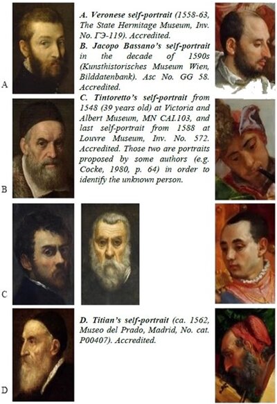 Including the recent study of Moriani (see below), there are at least thirty relevant authors in the disciplines of art and biography who refer to the identity of the musicians (see Table). It turns out that many of them make erroneous ascriptions (also to instruments) and none identifies the unknown person, although some refer to him as perhaps being Tintoretto, alluding to a certain resemblance (wrongly, in our opinion, as we will equally show in Figure 8).