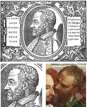 (1) La relevancia de Ortiz como músico contemporáneo fue enorme: era una de las figuras más representativas del arte de la interpretación con violas da gamba y Maestro de la Capilla Real de Nápoles, uno de los conjuntos más importantes del Renacimiento europeo, durante más de una década [55]. Está por tanto justificado suponer que Veronese decidiese incluir al maestro en el cuadro tañendo la viola tenor detrás de sí mismo.