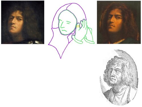 En el “contexto musical” representado en el lienzo (un consort de violas con pintores-músicos amateurs) pero también en el contexto social de la época, el poder simbólico de un músico de prestigio era sin duda superior al de un pintor aún de los más renombrados. La Figura 9 muestra, entre los dos autorretratos conocidos de Giorgione, la silueta aproximada del rostro que ocupaba el lugar de Ortiz en el diseño original.